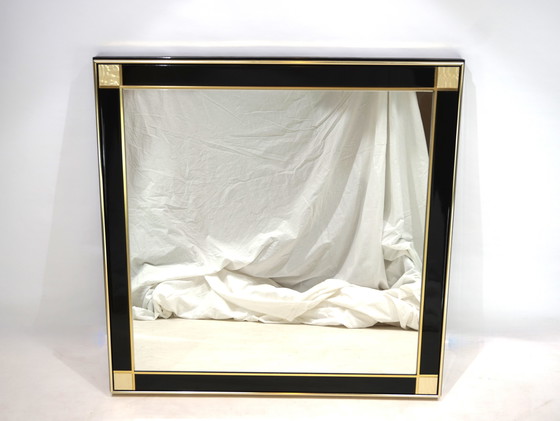 Este excepcional espejo de pared de Pierre Cardin, lacado en negro piano, se encuentra en muy buen estado. Impresiona con sus varillas de latón que enmarcan el impecable cristal. Las esquinas están adornadas con detalles de concha dorada y opalescente. El sólido marco negro remata la elegante apariencia de esta pieza. El diseñador de moda francés Pierre Cardin diseñó estos sillones en la década de 1970. Fue reconocido como pionero de la moda prêt-à-porter y sus diseños visionarios. Sus diseños de muebles siguen siendo muy codiciados hoy en día. El fabricante francés Roche Bobois es conocido por sus muebles innovadores y de alta calidad. Actualmente disponemos de un sofá de dos plazas, una otomana, una mesa de centro y dos sillones de esta serie.