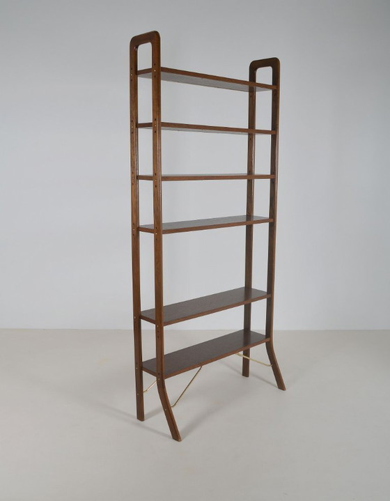 Estantería de pared danesa de madera, independiente, de la década de 1960. Esta estantería, con detalles en latón, cuenta con 6 estantes regulables en altura.