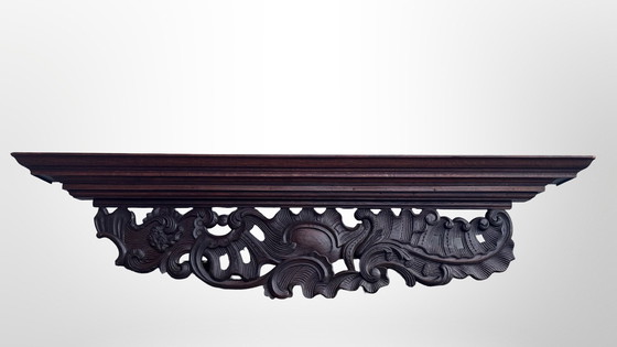 Esta gran estantería de pared de madera presenta tallas detalladas que le confieren un aspecto elegante y artístico. La estantería de pared rezuma artesanía y es ideal para colocar en ella objetos decorativos. El rico tono de la madera y los intrincados dibujos la convierten en una pieza llamativa en cualquier interior.