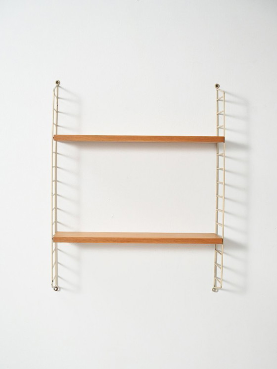 Estantería de pared escandinava de los años 60 con montantes metálicos lacados en blanco y estantes regulables de roble.