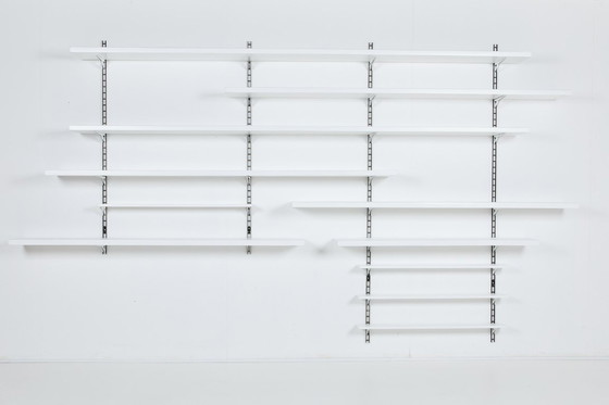 Estantería modular fabricada en los años 60 en Italia. Equipado con estantes ajustables que se pueden organizar/colocar según su propia configuración. Rieles murales de acero negro, estantes de madera pintados de blanco.