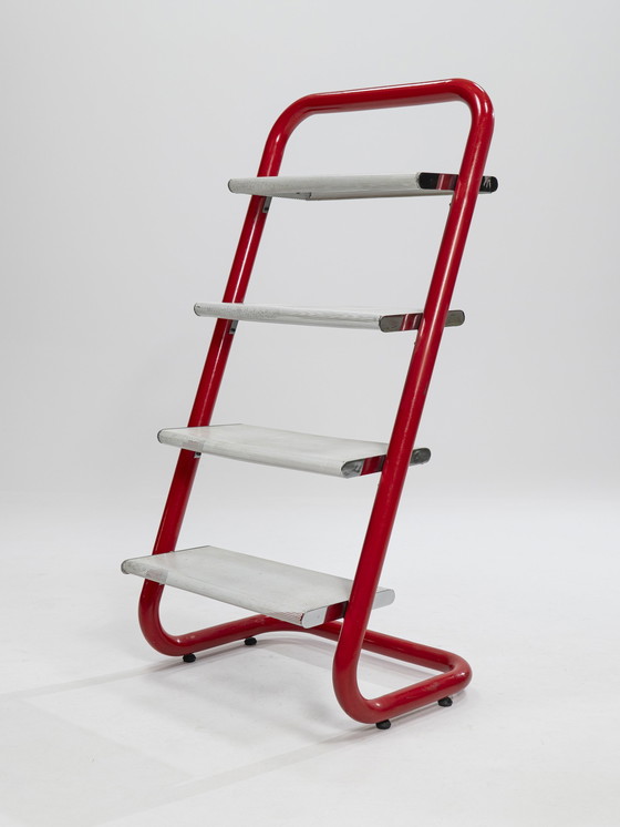 Esta estantería, aparentemente sencilla, consta de dos componentes: el marco tubular rojo, que se dobla hacia atrás hasta equilibrarse, y los estantes metálicos. Estos últimos se componen de dos piezas: el cuerpo de chapa perforada y los laterales cromados. Todos los elementos son redondeados, incluidas las pequeñas piezas de goma sobre las que se apoya, lo que la hace atractiva a la vista. Si no estuviera pintada de rojo, sino de un color más neutro, esta elegante pieza de diseño resultaría casi inofensiva, pero nos alegra que no sea así y que esta estantería no pueda confundirse con un diseño puramente funcional.