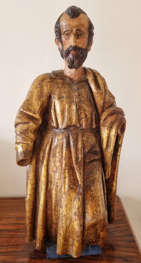 Esta hermosa estatua antigua de madera, que data del siglo XVII o XVIII, irradia un cálido brillo dorado que realza el refinado estilo barroco. Está elaborada con gran cuidado y artesanía, como lo demuestran los detalles de su expresión facial y las líneas fluidas de su vestimenta.