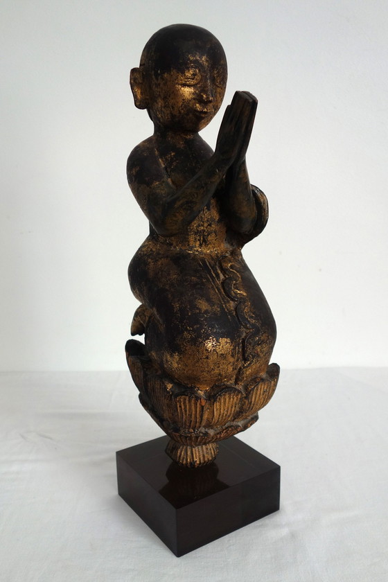 Estatua de madera tallada, patinada y dorada, que representa a un monje o adorador en oración, Birmania, siglo XX. Arrodillado en adoración, con las manos unidas en Anjalimudra, sobre lotos en flor de tallo largo. Base de plexiglás. Altura: 45 cm (la estatua mide 40 cm). Peso: 2,3 kg.