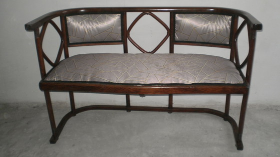 Está hecho de madera de haya curvada y tiene un asiento tapizado. Este modelo es mundialmente conocido y ya es un icono que ha demostrado su valía en la mayoría de los interiores. El sofá fue renovado hace unos años, por lo que se encuentra en muy buen estado, y el tapizado es nuevo. Procede de una colección privada.