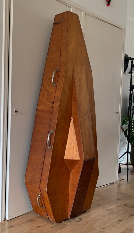 Una pieza muy especial procedente del Conservatorio de Ámsterdam. Este estuche para contrabajo ha sido testigo de muchas historias, y su carácter y pátina lo reflejan. La influencia de la Escuela de Ámsterdam es evidente. Puede transformarse fácilmente en un mueble bar o utilizarse como elemento decorativo. Preferiblemente recogida en persona.