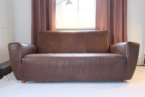 Sofá LONGA - Label - Gerard van den Berg. Este impresionante sofá de cuero marrón es de Label - Gerard van den Berg. Se encuentra en muy buen estado. El cuero presenta signos de desgaste, como arañazos, variaciones de color y manchas. Estas son inevitables con este tipo de cuero, pero contribuyen a su hermosa pátina. El respaldo del sofá presenta un atractivo acolchado de 8 pliegues, lo que lo hace ideal para uso independiente. El sofá proviene de un hogar libre de humo y mascotas. Largo: 74 cm Ancho: 180 cm Fondo: 85 cm Altura del respaldo al asiento: 47 cm Profundidad del asiento: 52 cm Altura del asiento: 40 cm