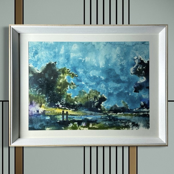 Esta acuarela presenta un paisaje abstracto del río Somme, plasmado en el distintivo lenguaje visual de Eugène Eechaut. Mediante capas de azul y verde y formas que se disuelven suavemente, el artista evoca agua, vegetación y cielo sin una descripción literal.