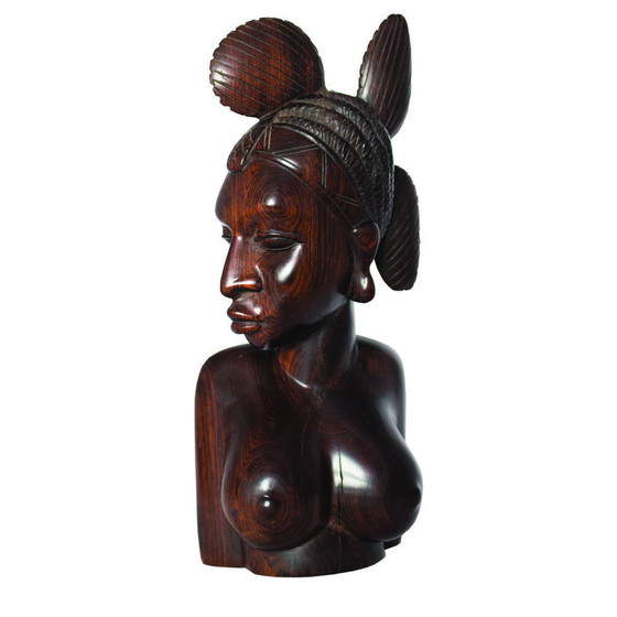 Impresionante busto guineano de madera de ébano tallado a mano de una mujer fulani, realizado a mediados de siglo. Los fulani son un grupo étnico nómada de África Occidental. La talla de ébano detalla el intrincado trenzado que representa los increíbles peinados tradicionales de las mujeres fulani de África Occidental. Los detalles de este peinado se muestran en fotografías antiguas. Se trata de una obra de arte excepcional y hermosa, en la que el artesano representa la belleza de la figura femenina con el excepcional uso del cincel. El presidente John F. Kennedy recibió en 1961 un busto similar de una mujer fulani del Ministro de Estado de la República de Malí, una escultura que actualmente se encuentra en la Biblioteca JFK. Las estudiadas proporciones, la atención prestada a los detalles más minuciosos, la calidad artística general de la composición e incluso las grietas antiguas presentes en la estructura de la madera son signos de autenticidad que marcan la diferencia entre esta obra de arte decorativa y las que se fabrican hoy en día.