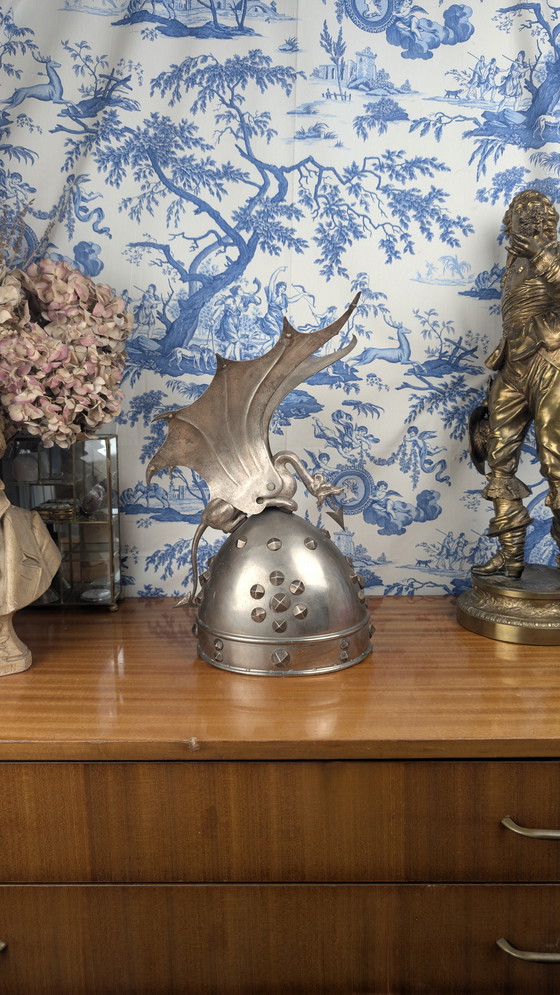 Auténtica pieza de museo, cuyo ejemplar idéntico se encuentra en la colección de artes escénicas del Museo de Bastia, este casco con base de acero y dragón de peltre cincelado es el de Sigurd, la figura heroica principal de la ópera en cuatro actos del mismo nombre: Sigurd, inspirada en el héroe mitológico nórdico escrita por Ernest Reyer en 1884.