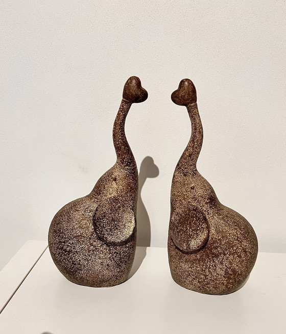 Este hermoso juego de dos figuras de elefantes irradia amor y armonía. Sus elegantes y estilizadas formas presentan un acabado en un cálido tono terroso con una sutil textura, creando un aspecto rústico y encantador. Están hechas de polystone. Las trompas, orientadas hacia arriba y terminadas en forma de corazón, simbolizan la felicidad, el amor y la prosperidad. Perfectas como detalle decorativo en el hogar, ideales para los amantes de los elefantes y el arte simbólico. Estas figuras encajan a la perfección en interiores modernos o bohemios y son un regalo especial para ocasiones especiales. Tamaño: 10 x 25 cm