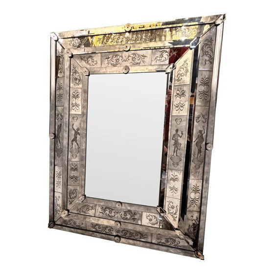 Espejo veneciano rectangular con figuras mitológicas asociadas al dios Baco, tallado a mano.