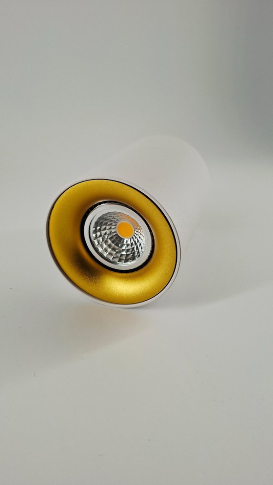 Foco/lámpara de techo cilíndrica de superficie en blanco de la marca belga Fantasia. La carcasa cilíndrica es de color blanco mate con recubrimiento en polvo y se vende de serie con un bisel interior blanco. Incluyo el bisel dorado, que se vende por separado como accesorio.