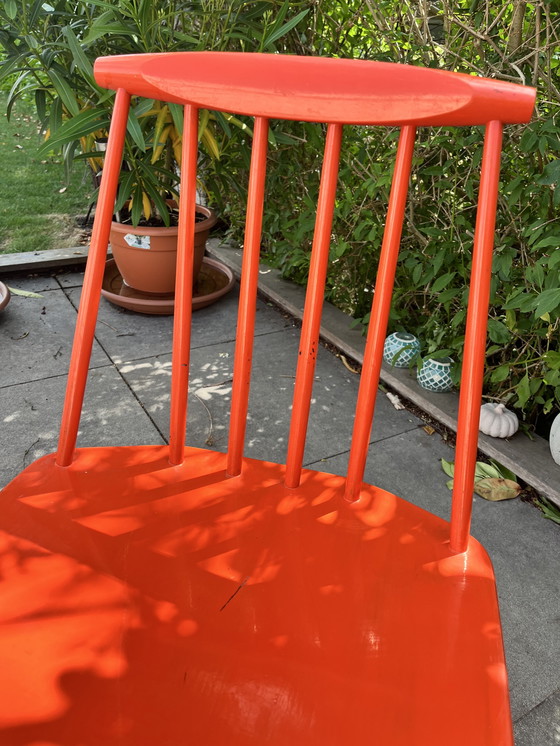 Esta es una clásica Silla J 77 danesa de estilo moderno de mediados de siglo Folke Palsson de FDB Mobler. Presenta un vibrante acabado rojo y un diseño elegante y minimalista típico de la estética moderna de mediados de siglo. La silla está fabricada en madera, lo que le confiere durabilidad y estilo. Su forma sencilla pero elegante la convierte en un complemento versátil para cualquier habitación, perfecta para comer o como elemento decorativo.
