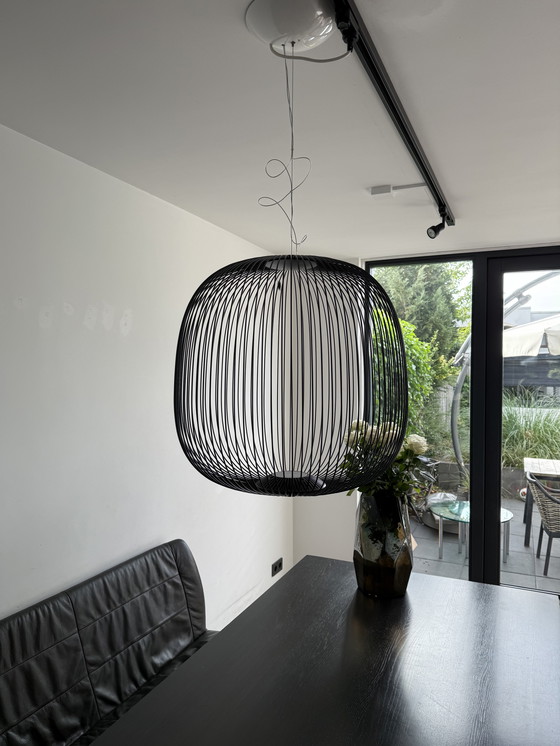 Spokes 2 de Foscarini es una moderna lámpara colgante con un elegante diseño de metal negro. Su estructura única crea un cautivador juego de luces y sombras, lo que la convierte en un elegante complemento para cualquier espacio contemporáneo. La lámpara es regulable, para que pueda ajustar el ambiente a su gusto. Perfecta para comedores o salones, esta pieza combina funcionalidad con atractivo estético.