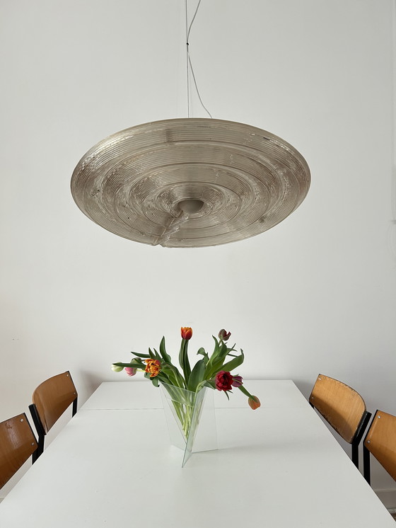 Lámpara Fresnel, tamaño L, 68 cm de diámetro. Diseñador: Dirk Van Der Kooij, 2013. Diseño elegante; la textura del plástico distribuye la luz de forma impecable. Los detalles están meticulosamente elaborados. La longitud del cable se puede ajustar hasta 300 cm gracias a un ingenioso sistema. Esta lámpara estaba colgada en una oficina, pero se vende por reforma de interior. Se encuentra en perfecto estado (ver las dos primeras fotos). Su precio original era de 2880 €.