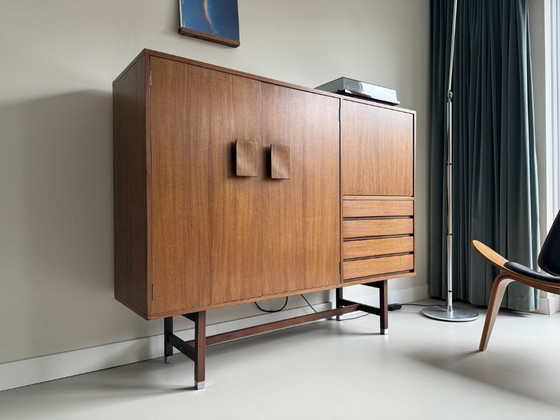 Elegante mueble auxiliar, diseñado por Inger Klinkerberg para Fristho en Franeker (Países Bajos), circa 1960. El mueble está acabado en chapa de palisandro con vetas preciosas y descansa sobre una sólida estructura de palisandro con patas de aluminio. Un diseño de alta calidad de uno de los fabricantes de muebles holandeses más prestigiosos.