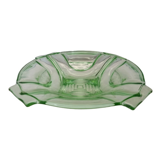 Exclusivo frutero Art Déco verde de Walther & Söhne, Alemania. El cuenco está hecho de vidrio prensado verde y se encuentra en perfecto estado. August Walther fundó su cristalería en 1888 en Ottendorf-Okrilla, cerca de Dresde, y la bautizó como August Walther & Söhne AG. Producían una amplia gama de vajillas y cristalería decorativa. El cuenco se encuentra en perfecto estado. Dimensiones: 33 x 7 cm (ancho x alto). N.º 6857.
