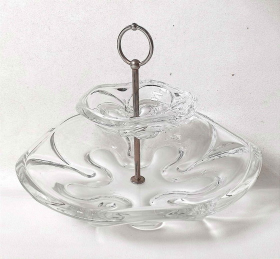 Con 25 cm de altura, este compotero de vidrio transparente se distingue por su diseño refinado y líneas fluidas, típicas de la época.