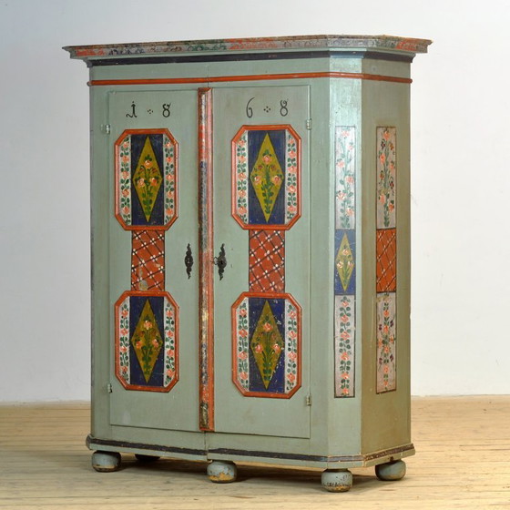 Este armario de pino con carácter, procedente de la Alemania rural del sur, data de 1868 y es una pieza especial con una historia romántica: fue un regalo de bodas. Está pintado a mano en colores vibrantes y cálidos y luce un hermoso motivo floral. Conserva las bisagras y la cerradura originales, lo que realza su autenticidad. En su interior hay dos estantes. La pieza está en buen estado, libre de carcoma y lista para usar. Una pieza única y acogedora que complementará cualquier interior.