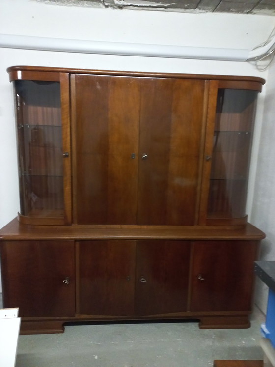 Precioso mueble de los años 50 con un estilo clásico. Este mueble combina funcionalidad con un estilo atemporal, perfecto para cualquier sala de estar o comedor. La cálida madera marrón y los paneles de cristal le dan una apariencia elegante. Ideal para guardar vajilla o libros.