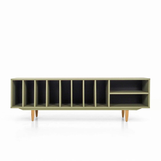 El resto del mueble está compuesto por elegantes compartimentos deslizables, ajustables en incrementos de 5 cm, para guardar vinilos, revistas favoritas u otros objetos de valor.