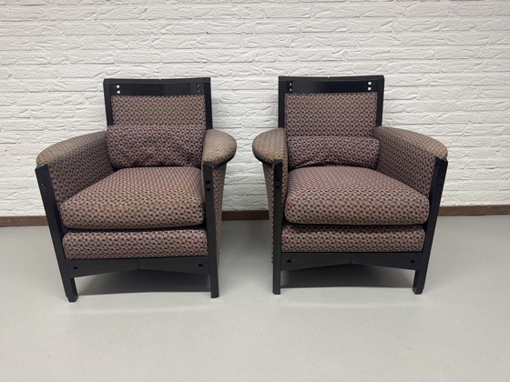 Sumérgete en el mundo del diseño posmoderno italiano con este impresionante conjunto de sillones "Peggy" de Umberto Asnago para Giorgetti. Fabricados en la década de 1990, estos sillones presentan una elegante estructura lacada en negro y una exclusiva tela floral en tonos azul, gris y verde que aporta un toque de elegancia a cualquier espacio. Ideales para quienes aprecian la originalidad y el estilo, estos sillones se encuentran en excelentes condiciones, conservando su tela y encanto originales.