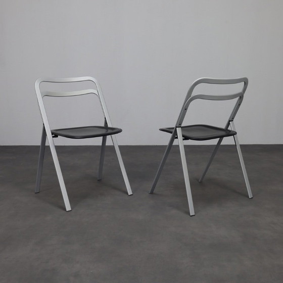 Un buen ejemplo del modernismo italiano, donde la claridad racionalista se une al diseño práctico. Estas sillas plegables, diseñadas por Giorgio Cattelan para Cidue, presentan una estructura minimalista de aluminio combinada con asientos de cuero de contornos suaves. Las sutiles curvas y líneas esbeltas les confieren un carácter gráfico y escultural, mientras que la mezcla de metal y piel añade calidez y refinamiento.