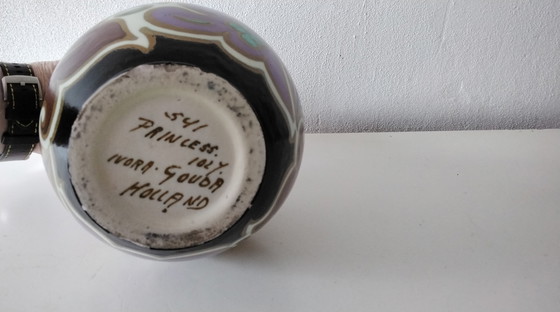 Este antiguo jarrón de plato de Gouda, fabricado hacia 1925, es un bello ejemplo de diseño Art Déco. El jarrón fue fabricado por Ivora y presenta una llamativa combinación de colores en negro, marrón, amarillo, azul y morado. El material cerámico y los detallados dibujos lo convierten en una pieza de coleccionista única. Perfecto para los amantes de las antigüedades y el diseño.
