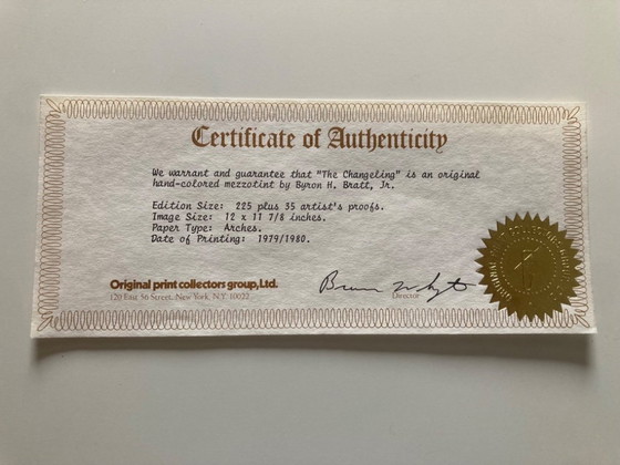 «El Cambiante», mezzotinta original coloreada a mano. Edición firmada de 225 ejemplares. Dimensiones con marco: 19 1/8 x 18 7/8 pulgadas. Adquirida en 1980 en el grupo de coleccionistas de grabados originales de Nueva York. Precio original: 250,00 dólares. Heredada de mi padre.