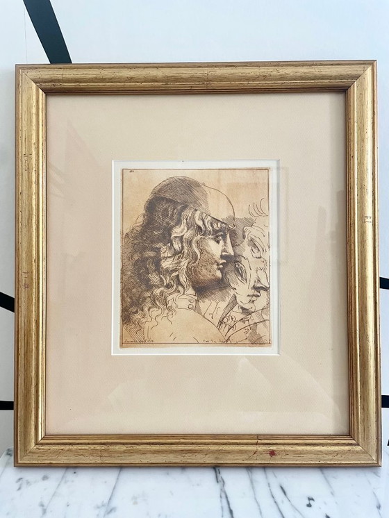Este grabado antiguo, en cálidos tonos sepia, reproduce un dibujo atribuido a Leonardo da Vinci. El número 135, impreso en la esquina superior izquierda, sugiere que formó parte de una carpeta o publicación de arte de finales del siglo XIX o principios del XX. El modelo es un impactante perfil masculino renacentista, con rasgos delicadamente dibujados, cabello expresivo y una postura clásica que evoca los icónicos estudios de da Vinci. El papel desgastado por el tiempo le confiere una pátina auténtica, elegantemente realzada por un marco vintage de madera dorada y un paspartú color crema. Esta pieza está lista para colgar y es perfecta para añadir un toque histórico a una sala de estar, una biblioteca, una oficina o un gabinete de curiosidades. ✨ Detalles del artículo: • Artista: según Leonardo da Vinci • Tipo: grabado antiguo / reproducción fotomecánica • Número en placa: 135 • Medio: impreso en papel envejecido, tono sepia • Tamaño del marco: 40 x 36 cm (aprox. 15,7" x 14,2") • Tamaño de la imagen: 19 x 16,5 cm (aprox. 7,5" x 6,5") • Enmarcado: bajo vidrio, en un marco de madera dorada con tapete crema • Estado: buen estado vintage: algunas marcas relacionadas con la edad en el papel y desgaste menor en el marco (ver fotos)