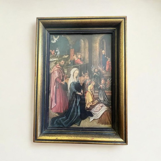 Un pedazo de historia del arte. Un grabado de Hans Holbein el Viejo que muestra el nacimiento de Cristo. Este cuadro tiene un estatus similar al de la Mona Lisa y se muestra aquí en una estampa artística de la década de 1930. En su marco original.