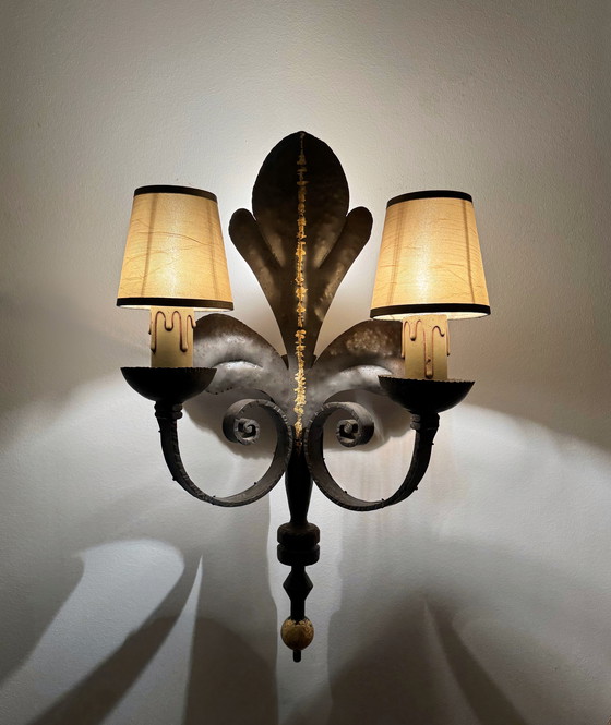 Amplio y elegante aplique de pared de dos brazos en hierro forjado martillado, decorado con una gran flor de lis central que oculta una bombilla en la parte posterior. La flor de lis está adornada en el centro con pan de oro, que también se encuentra en la bola del extremo del brazo central. Presenta pantallas de clip en tela marrón dorado. En muy buen estado general, utiliza tres bombillas de bayoneta.