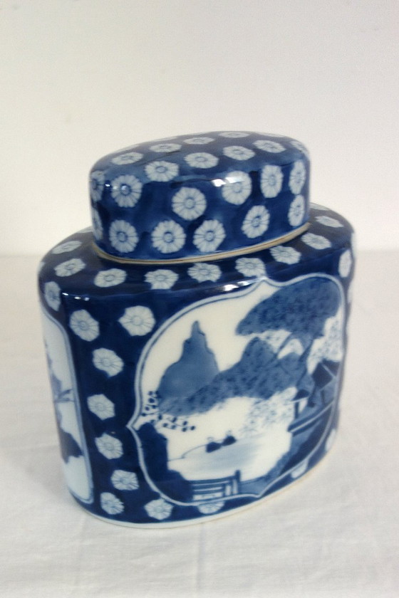Gran bote para té o tarro de jengibre de inspiración asiática de la década de 1960. Cerámica azul y blanca, forma ovalada.