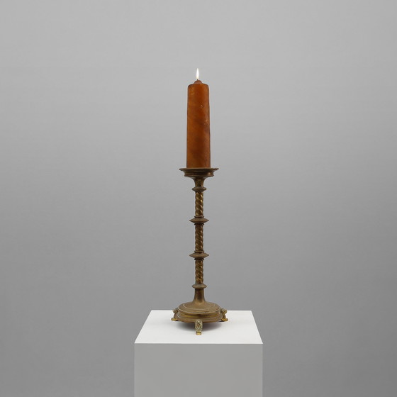 Gran candelero de cobre para iglesia o altar con base decorada en forma de trípode, que descansa sobre tres patas con volutas. La base está decorada con María, Jesús y José y ángeles encima. El vástago estriado está decorado con crestas y hojas de acanto.