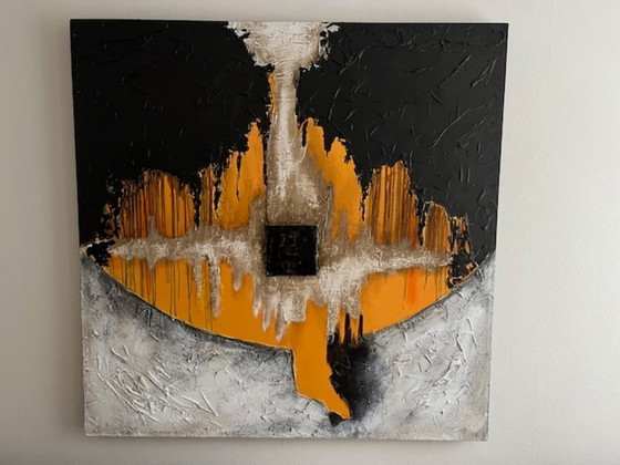 Este gran cuadro abstracto de 150 x 150 cm es un verdadero imán para las miradas en tu hogar. Con su atrevida paleta de colores en negro, naranja y gris, aporta un ambiente dinámico y moderno a cualquier estancia. La textura y profundidad del lienzo le confieren una dimensión extra, convirtiéndolo en un elemento vibrante para tu pared.