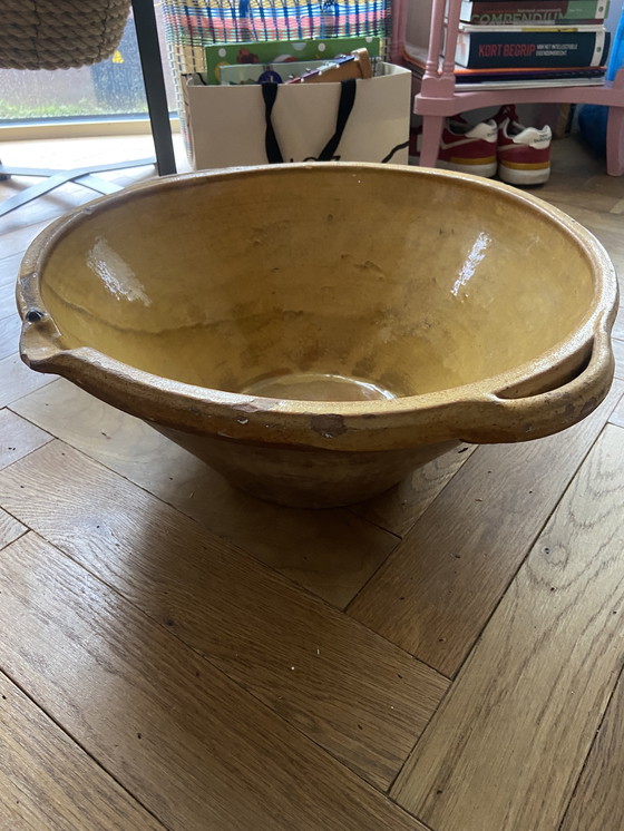Retroceda en el tiempo con este exquisito cuenco grande para espumadera, procedente de la Francia del siglo XIX. Su rica historia se refleja en los cálidos tonos terrosos de marrón y amarillo, ofreciendo una visión de la artesanía de una época pasada. Perfecto para añadir un toque de encanto vintage a cualquier espacio, este cuenco es a la vez una pieza funcional y un tesoro decorativo.