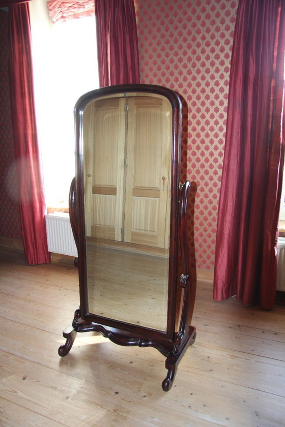 Gran espejo de pie de caoba de estilo victoriano de la reconocida marca Eichholtz. Esta hermosa pieza, con su cristal tallado en facetas, es ajustable y de alta calidad.