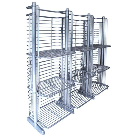 Estantería Art Decó francesa extremadamente rara y de gran tamaño, con tres nichos de tres niveles cada uno, construcción totalmente de aluminio muy inusual sin tornillos, remaches ni pernos visibles.