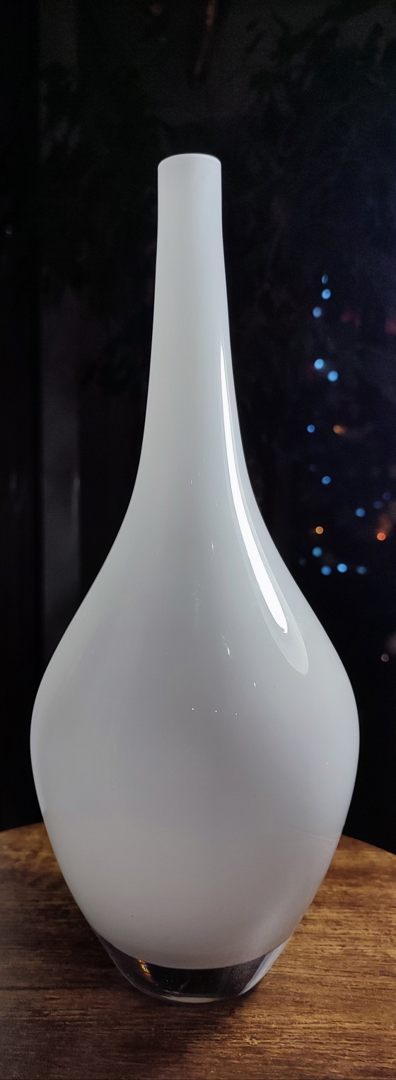 Gran jarrón vintage "Salong" de los años 90 de Johanna Jelinek para IKEA, vidrio blanco soplado a boca, forma moderna y atemporal.