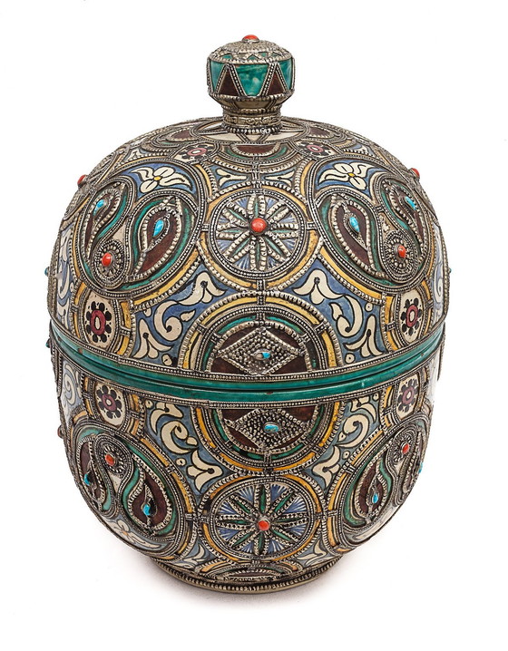 Gran Jobanna Real de loza, con tapa tipo kouba. Mantequera (smen). Decoración floral y geométrica policromada, con base de plata cincelada. Magreb, principios del siglo XX.