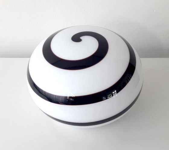 Una hermosa y única lámpara de mesa/pie de cristal de ILU di Vetro, modelo Zebra, con un diseño en espiral negro. La pantalla de cristal está montada sobre una base metálica revestida de blanco y se fija con tres largos tornillos de latón que se pueden aflojar para, por ejemplo, cambiar la bombilla. El cristal es bastante grueso y procede de Italia. La lámpara tiene forma de "bola prensada". El espiral, añadido a mano (¡por lo tanto, único!), recorre la parte inferior de la lámpara. Diseñada por la empresa holandesa ILU design, esta lámpara formaba parte de su línea Vetro, fabricada con cristal italiano. ¡La lámpara proporciona una luz hermosa y acogedora que se integra en cualquier interior! Dimensiones: Altura aproximada: 26 cm, diámetro aproximado: 35 cm. La lámpara tiene un casquillo E27, un cable de color cobre con interruptor y un enchufe europeo plano de dos clavijas. La lámpara lleva una etiqueta adhesiva ILU en el casquillo y en el globo de cristal. La lámpara está en buen estado. ¡Para una mejor impresión, vea las fotos!