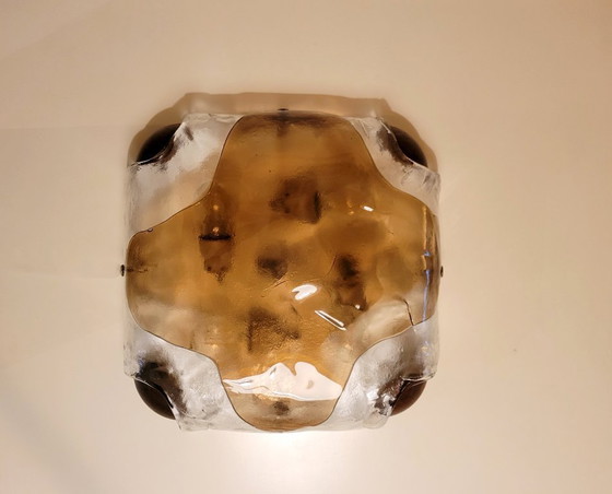Una hermosa lámpara de techo o de pared de cristal de Murano soplado a mano por Kaiser Leuchten, Alemania, 1970. Su estilo evoca el diseño brutalista. El vidrio grueso y texturizado está montado sobre una base de metal y roble. Este es un magnífico ejemplo de la alta calidad de Kaiser Leuchten. La lámpara se encuentra en muy buen estado.