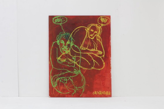 Una impactante pintura figurativa abstracta de gran formato de 195 cm de alto y 144 cm de ancho. Realizada sobre un fondo rojo intenso, la composición presenta expresivos dibujos lineales continuos en vibrantes tonos verde y amarillo, formando dos figuras humanas interconectadas. Las líneas fluidas sugieren intimidad, diálogo y tensión emocional, mientras que el intenso contraste de color amplifica la profundidad psicológica de la escena.