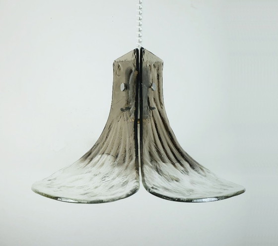 Fantástica lámpara colgante de gran tamaño fabricada por Kalmar Franken KG entre los años 60 y principios de los 70. Diseño atribuido a Carlo Nason. La pantalla consta de 3 discos de cristal en forma de pétalo de flor en gris humo y cristal translúcido hielo. Para 1 bombilla E27 (bombilla no incluida).