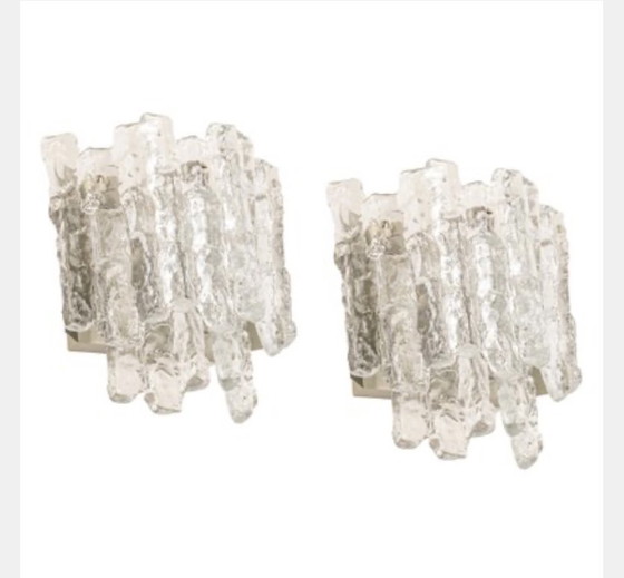Hermoso par de apliques de pared de mediados de siglo con cinco piezas de cristal de Murano hielo, fabricados por Kalmar, Austria, entre 1960 y 1969. Cada aplique necesita tres bombillas E14 pequeñas. Es posible instalar esta lámpara en cualquier país (EE. UU., Reino Unido, Europa, Asia y Australia). Con cableado fijo, en buen estado.