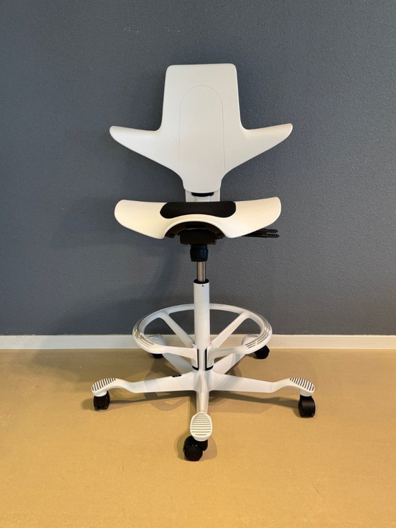 Nuevo HAG Capisco Puls. El famoso taburete Capisco de Peter Opsvik, con elevación de gas alta y reposapiés. Altura del asiento: 53-79 cm. Plástico blanco con asiento de tela negra.
