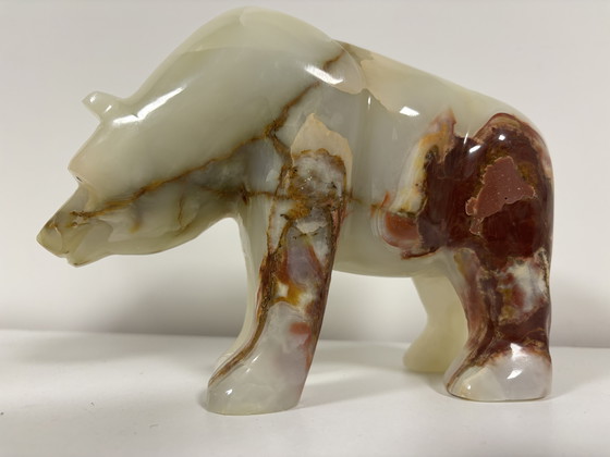 Esta exquisita escultura de ónix de un oso polar, tallada a mano, es un testimonio del arte y la habilidad de su creador. La superficie lisa y pulida del ónix captura la luz con belleza, resaltando las variaciones naturales de color y patrón que hacen que cada pieza sea única.