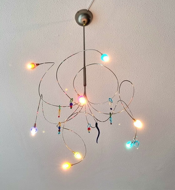 Esta hermosa lámpara cuenta con vibrantes elementos de cristal Murini en blanco, azul, verde, amarillo, morado, marrón y rojo, creando un ambiente alegre y refinado.
