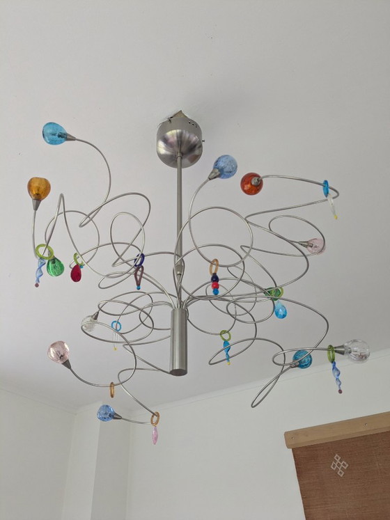 Esta lámpara de diseño holandés fue diseñada por Harco Loor en los años 80/90. Sus 12 esferas de colores y 11 adornos están hechos de cristal de Murano veneciano soplado a mano. En su momento, se produjo en edición limitada. Cada esfera contiene una bombilla halógena G4, que se puede sustituir por bombillas LED G4. La altura desde el techo es de 75 cm y el diámetro es de aproximadamente 75 cm. Tres adornos están rotos y unidos entre sí por un hilo fino, invisible a simple vista (ver fotos); a uno de ellos le falta la parte inferior.